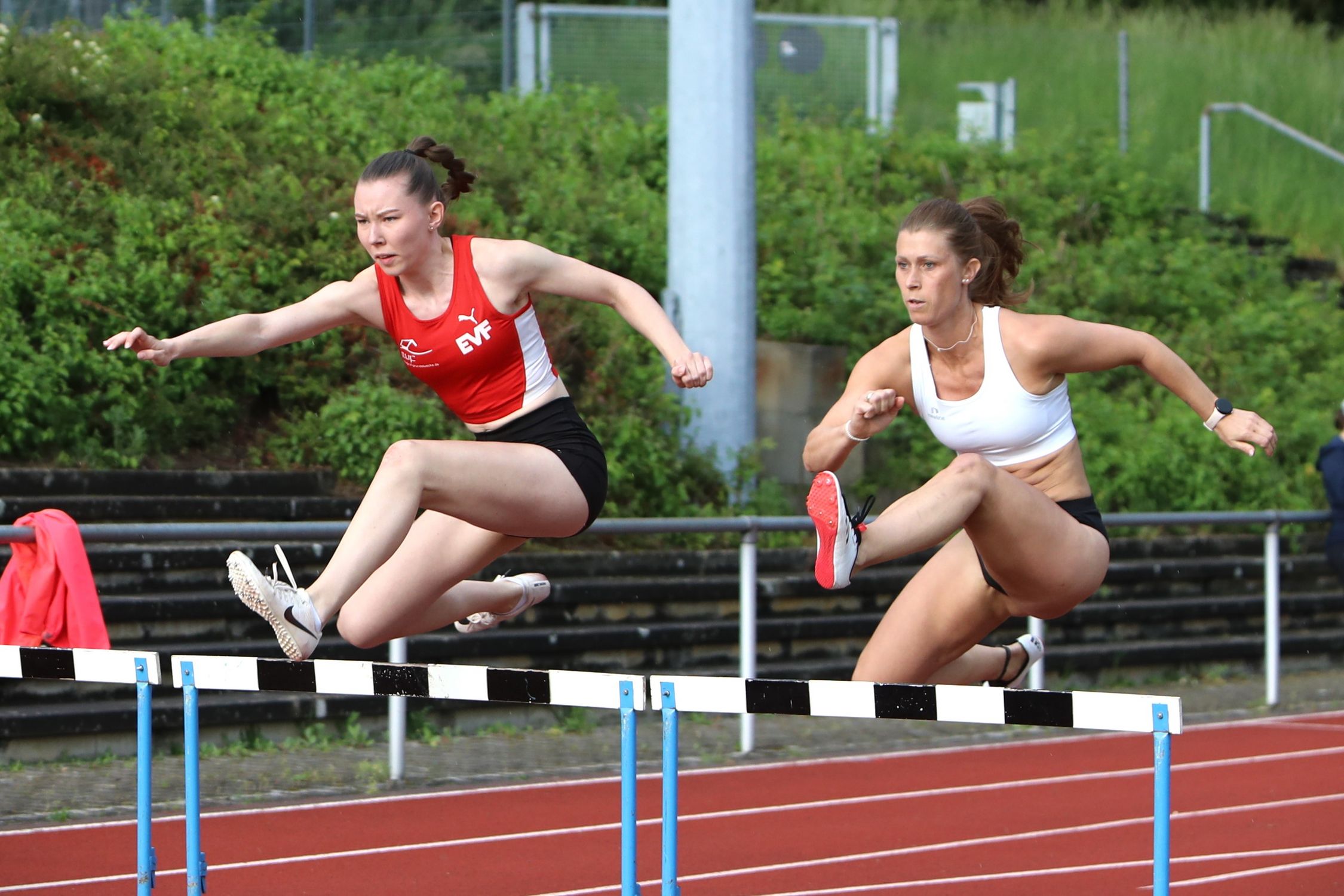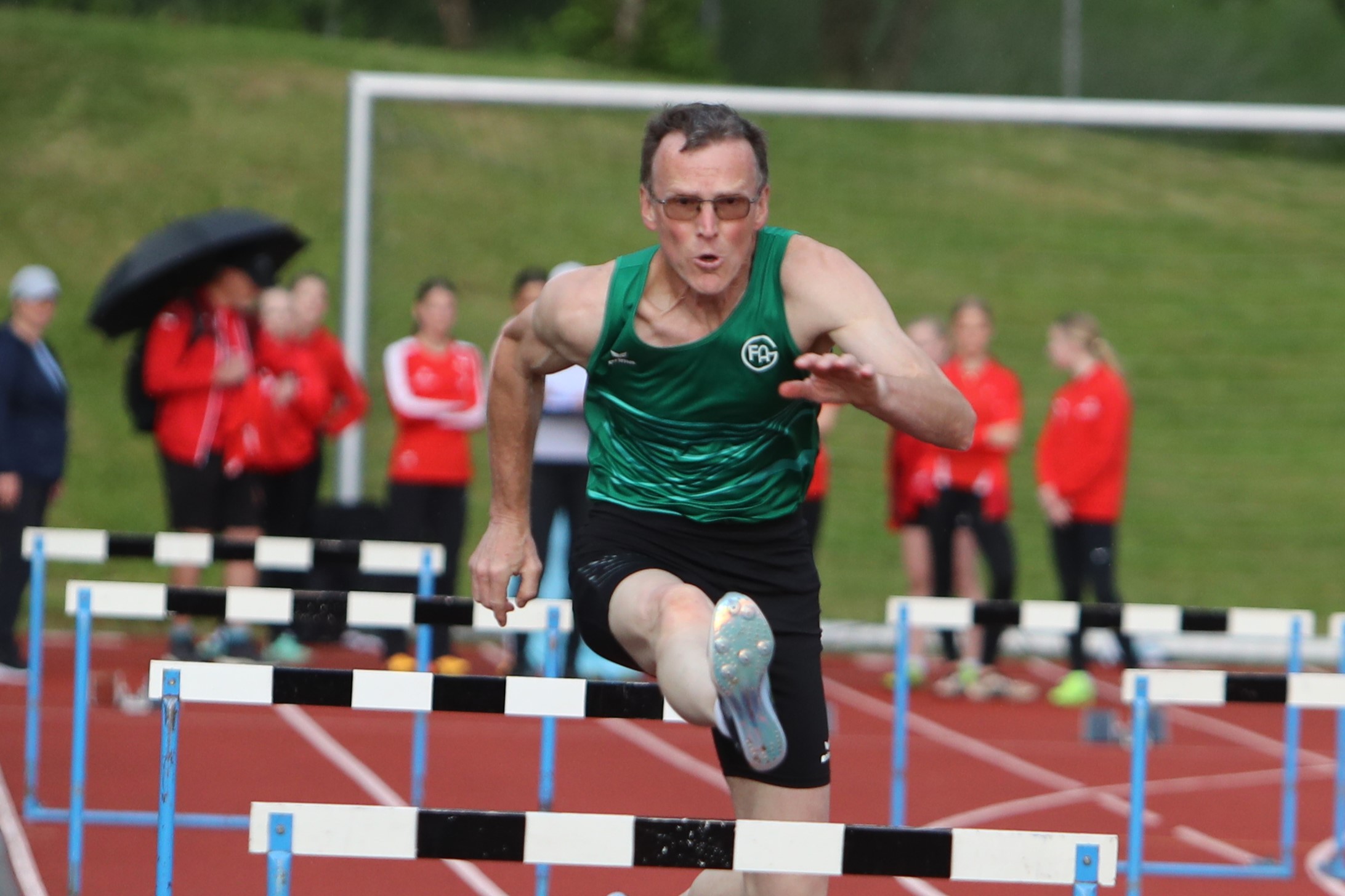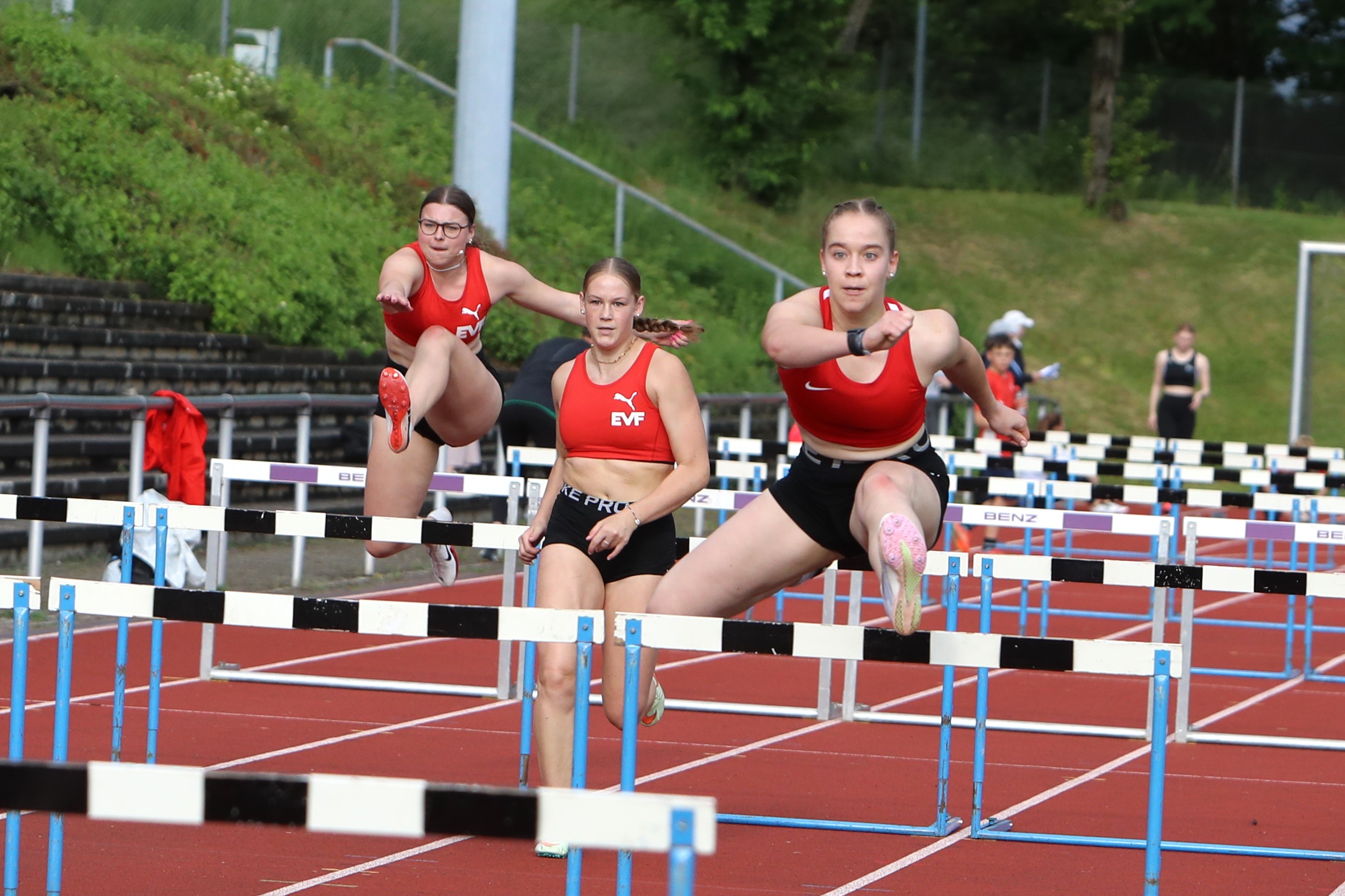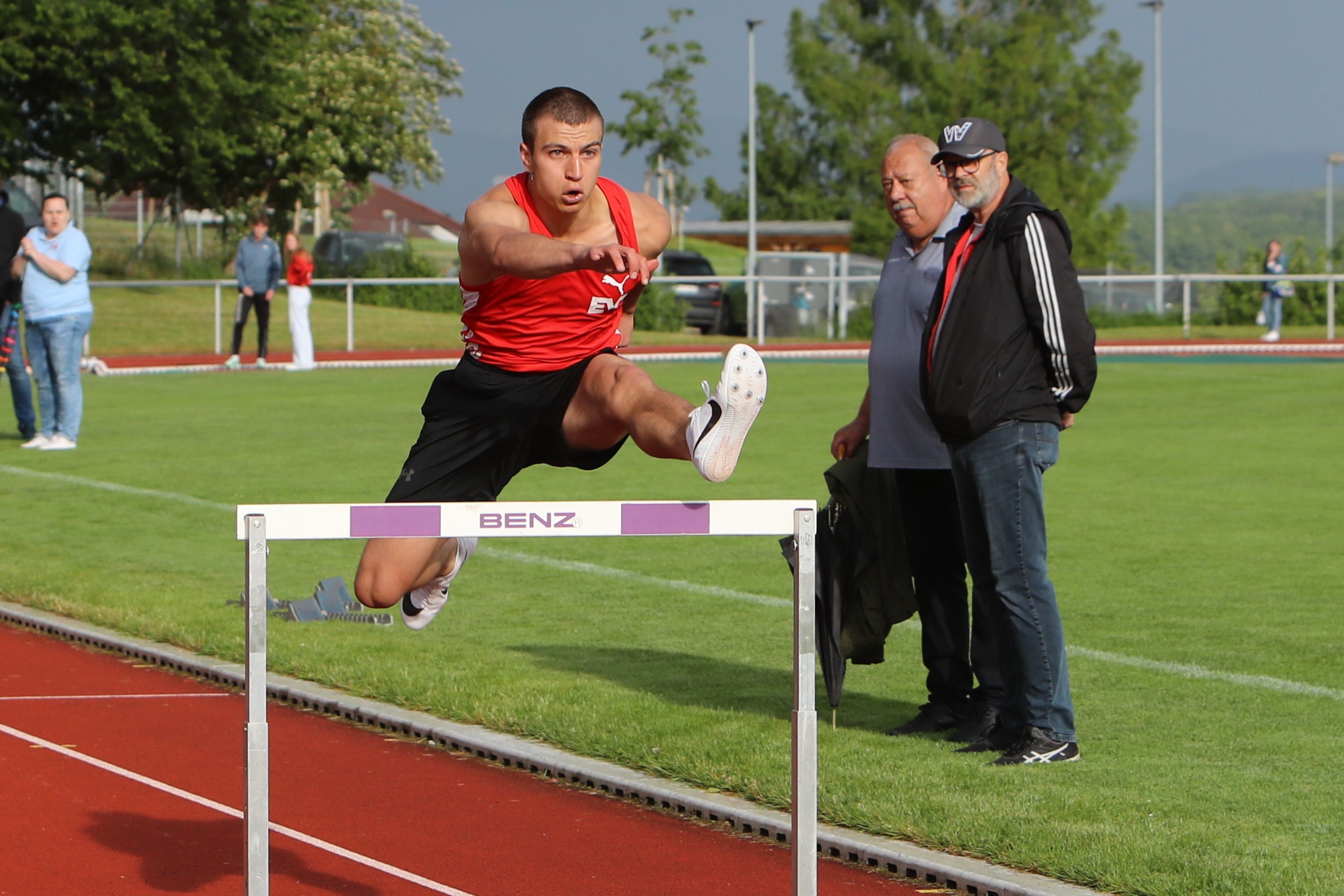 Die Leistungen der 50 Athletinnen und Athleten konnten sich sehen lassen, zahlreiche persönliche Rekorde. auch bei den Rahmen-Wettbewerben, Diskuswurf und Läufe über 100 und 75 Meter, wurden registriert. Konkurrenzlos doppelter Kreismeister bei den Männern wurde Nicolas Börsken von der LG Filstal im 110 m Hürdenlauf in persönlicher Rekordzeit von 17,28 Sekunden. Bei Stabhochsprung überquerte der Holzhäuser 3,20 Meter. Felix Pätzold, U20 der LG Filstal, sprang 3,60 Meter. Ebenfalls ohne Konkurrentin erkämpfte sich die Filstälerin Amelie Frech den Titel bei den Frauen. Sie verglich sich im 100 m Hürdenlauf, den sie in 16,64 Sekunden bestritt, mit der Gast-Athletin Sabine Bittmann vom TV Oberhaugstett (18,13). Sehenswert war das 100 m-Hürden-Rennen der U20 mit Isabell Frank von der Turnerschaft Göppingen, und den Filstal-Athletinnen Milla Zuegel und Lara Kneifel, das erwartungsgemäß die Göppinger Top-Athletin, mehrfache baden-württembergische Meisterin und in diesem Jahr zur Sportlerin des Jahres gekürt, souverän für sich entscheiden konnten. Dabei zog sie ihre Konkurrentinnen auf persönliche Rekordzeiten. Zuegel finishte in 16,61, Kneifel in 19,80 Sekunden. Auch Robin Börsken von der LG Filstal, vor Monatsfrist U18-Landesmeister über 5000 Meter in Rottenburg, konnte im 400 m-Hürdenlauf in 58,51 Sekunden eine Bestleistung verbuchen und nach dem Titel greifen. Auf das Siegerpodest bei der U18 stieg konkurrenzlos Lilli Marie Kasper (LGF) in 17,29 Sekunden. 80 m-Hürden-Gold bei der W15 und W14 ging an dessen LG-Kameradinnen Leni Aigner in 12,27 und Luisa Bolzmann in 13,45 Sekunden. Zweifacher Titelträger bei der M14 wurde Henry Spiegelburg, 13,23 Sekunden über 80 m Hürden und 3,20 m an der Stabhochsprunganlage. Seine herausragenden Fähigkeiten bei den Senioren M60 stellte Klaus-Dieter Hutter von Frisch Auf Göppingen beim 100 m-Hürden-Sprint in 16,79 Sekunden unter Beweis. An Pfingstsamstag rannte er beim Seniorensportfest in Edenkoben in 16,65 Sekunden hinter Oliver Kurtz (Friedberg-Fauerbach) auf Rang zwei und hat sich nun in der Deutschen Bestenliste hinter seinem Konkurrenten auf dem zweiten Platz eingetragen. Kreismeister der M12 über 60 m Hürden wurde in 11,61 Sekunden Matti Prestel im Filstäler Trikot.