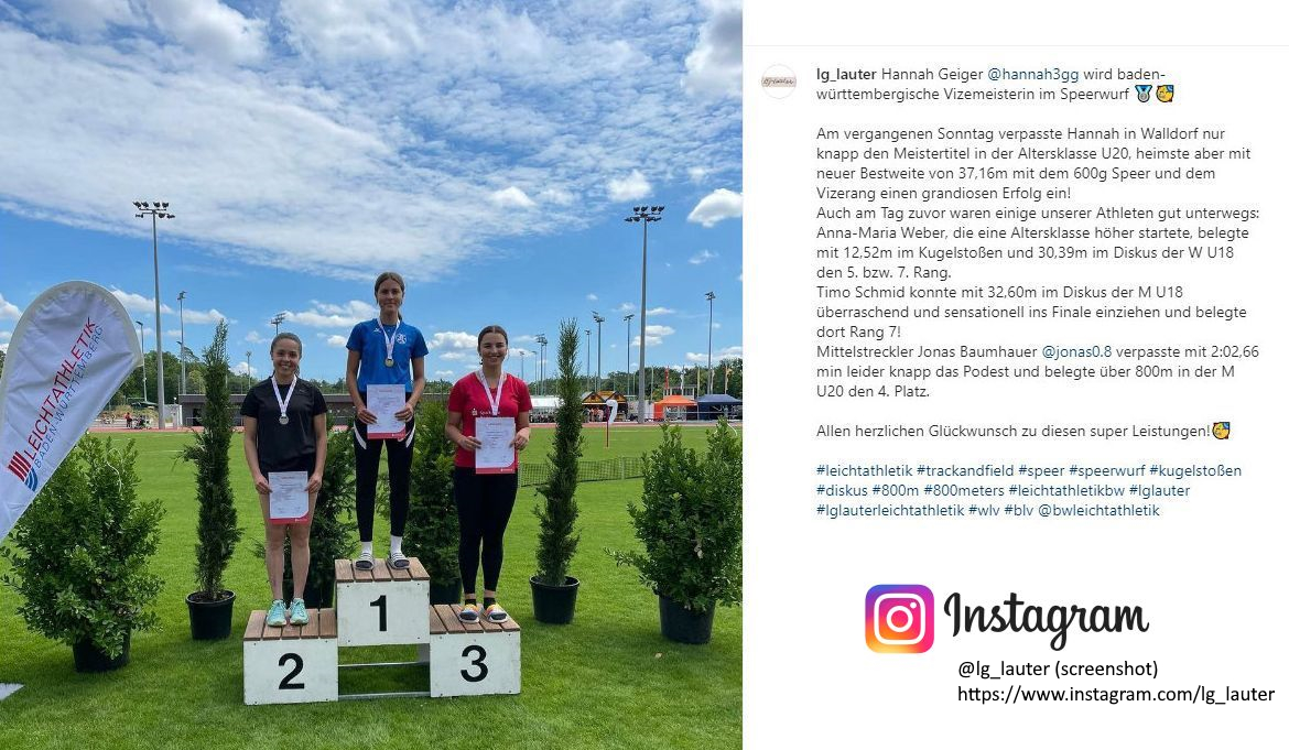 Die U20-Athletin katapultierte den 600 g-Speer bei ihrem fünften Versuch auf 37,16 Meter und verbesserte ihren Rekord um 30 Zentimeter. Erst im letzten Versuch (37,27) ihrer stärksten Konkurrentin, Lea Engfer (SV Stuttgarter Kickers), die elf Zentimeter weiter warf, wurde die bis dahin führende Donzdorferin auf den Silberplatz verwiesen.