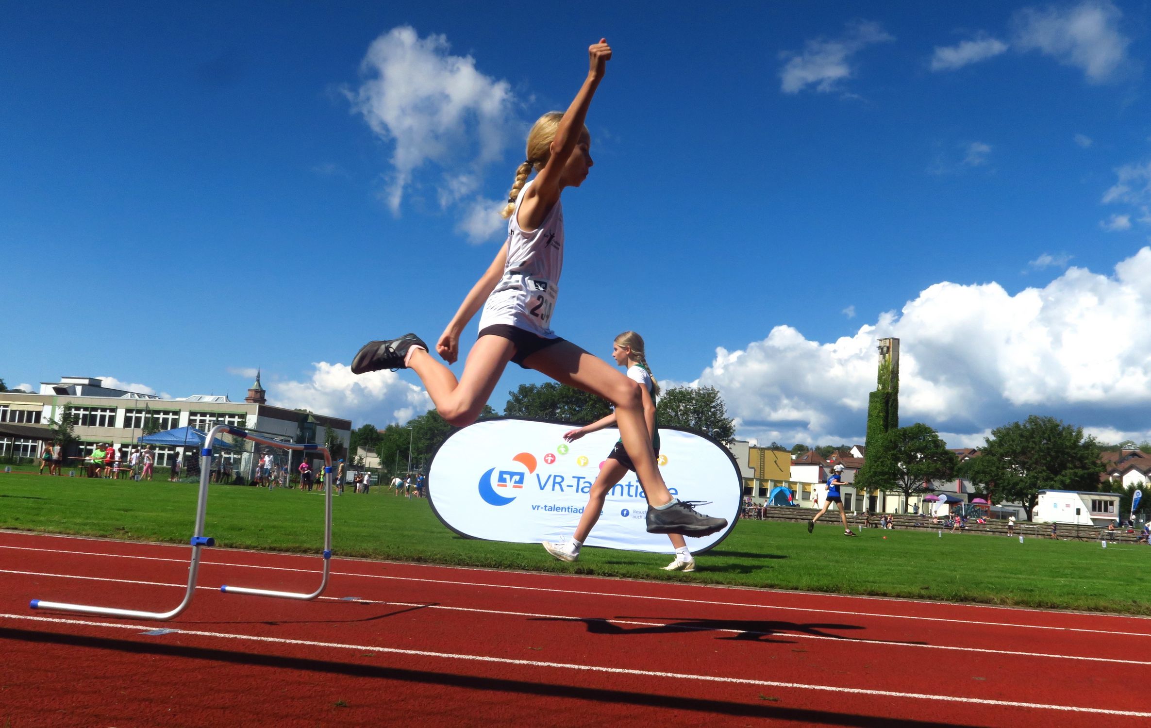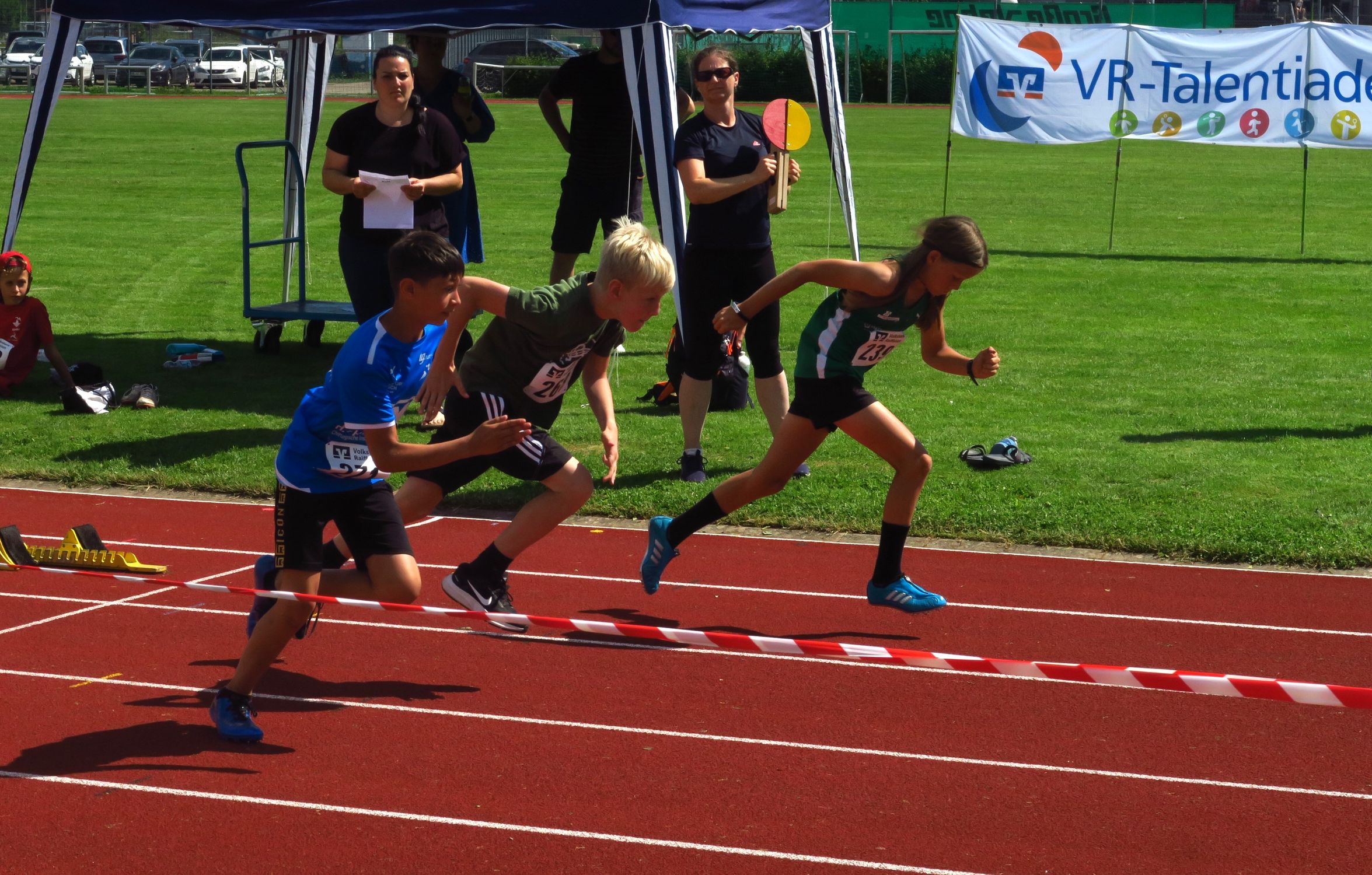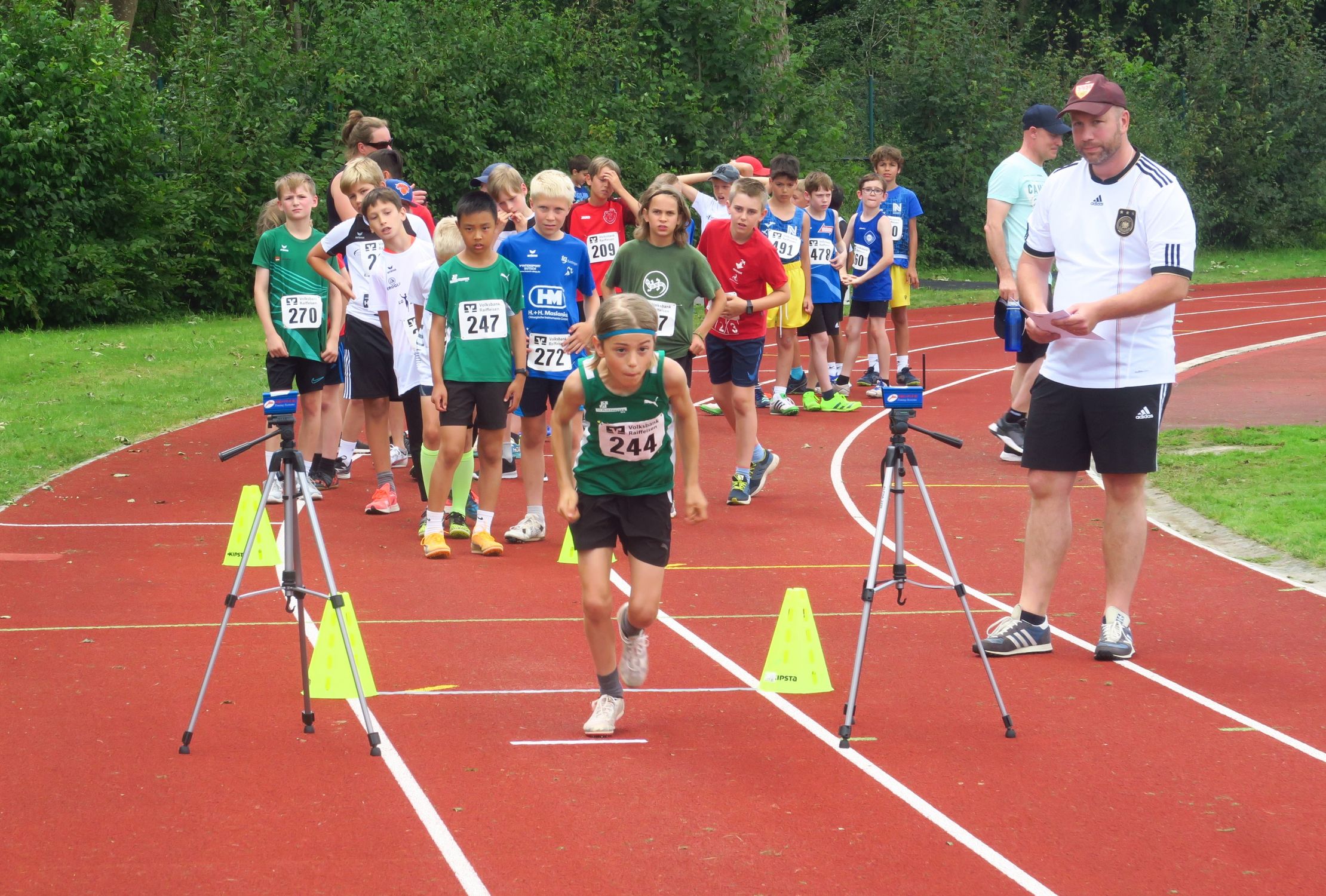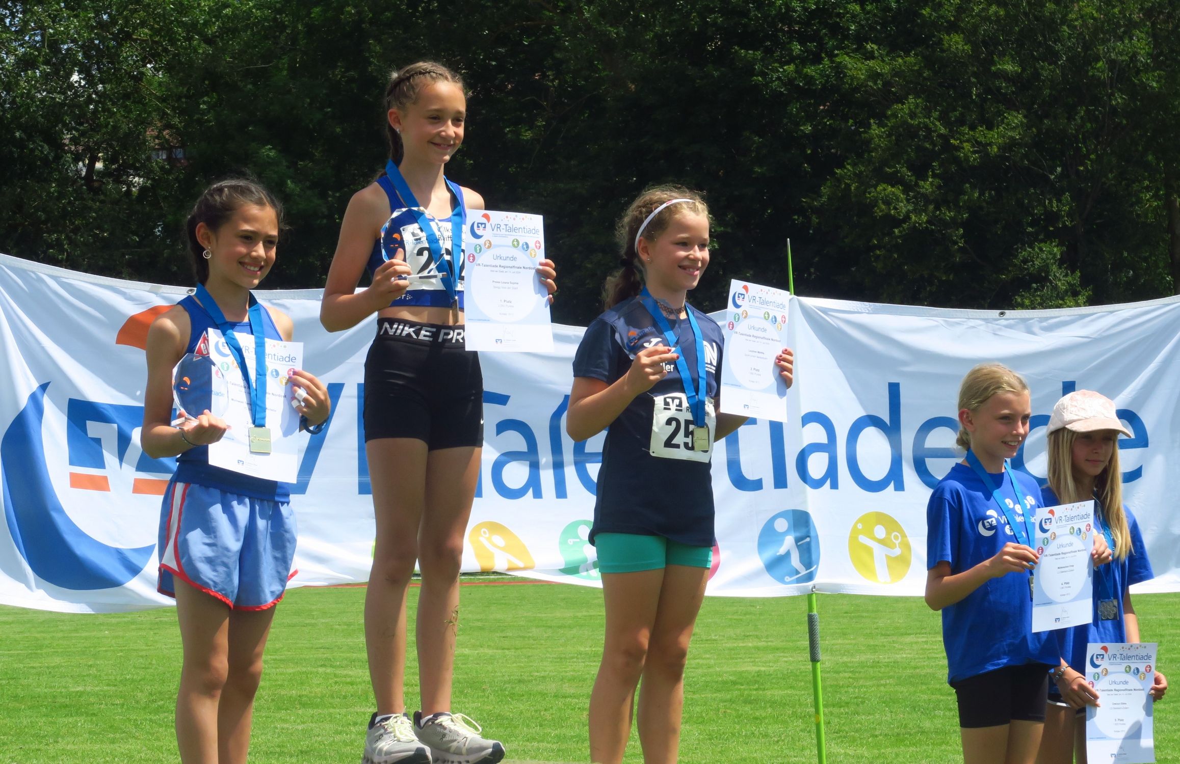 Knapp drei Stunden nach dem Einmarsch konnte Sprecher Markus Fritzsche zur Siegerehrung aufrufen. Aus den Händen von Sevtap Yesilyurt, Regionalmarkleiterin der sponsernden Vereinigten Volksbanken, gab es Urkunden, Medaillen, Siegerpokale und kleine Sachpreise, so dass niemand mit leeren Händen nach Hause fahren musste. Tolle Eindrücke und viele neue Bestleistungen hatten ohnehin schon die meisten im Gepäck. Angenehme sommerliche Temperaturen – im Vergleich zur Hitzeschlacht im Vorjahr in Pliezhausen – und eine reibungslose Organisation machten das Ganze für die 90 Kinder und deren Eltern und Betreuer zu einer runden Sache, für die viele Anreisewege bis zu 90 Minuten auf sich genommen hatten. 18 Vereine hatten im Vorfeld ihre Ergebnisse für eine Teilnahmeberechtigung am Finale eingereicht. Im nächsten Jahr dürfen es gerne noch mehr sein.